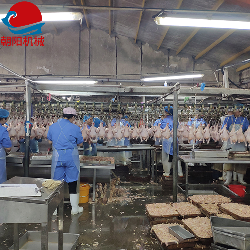 注:產(chǎn)品不同,工藝流程有差距。諸城市朝陽機械有限公司是一家集家禽屠宰設(shè)備、家禽屠宰流水線研發(fā)生產(chǎn)和設(shè)計銷售于一體的生產(chǎn)制造商。公司具有較完善的設(shè)計、研發(fā)、檢測和售后體系,并且具有雄厚的技術(shù)力量,進步的工藝設(shè)計水平、屠宰設(shè)備和安裝水平,是國內(nèi)家禽屠宰機械行業(yè)代表性企業(yè)。公司長期與國內(nèi)外屠宰加工企業(yè)合作,走引進——消化——創(chuàng)新和自主研發(fā)相結(jié)合的道路,在國內(nèi)外同類產(chǎn)品的基礎(chǔ)上,不斷更新和改造。公司主要設(shè)備有:A字型立式脫毛機、臥式脫毛機、強力噴淋機、松毛機、浸燙池、螺旋預冷機、禽籠清洗機、電暈機、兔扯皮機、兔割前爪/后爪機、剝胗機、自動洗鉤機、螺旋燙爪機、雞爪脫皮機、分割輸送帶等屠宰用設(shè)備。其中,公司獨力發(fā)明生產(chǎn)設(shè)計的“電動調(diào)節(jié)脫毛機”及“自動控水控溫浸燙池”順利通過知識產(chǎn)權(quán)局的實質(zhì)性審查。公司所生產(chǎn)的設(shè)備性能達到國際同類產(chǎn)品水平,處于國內(nèi)超前地位,可與國外同類產(chǎn)品配套使用,設(shè)備遠銷阿爾及利亞、澳大利亞等中東、非州等并建立了長期穩(wěn)定的合作關(guān)系。